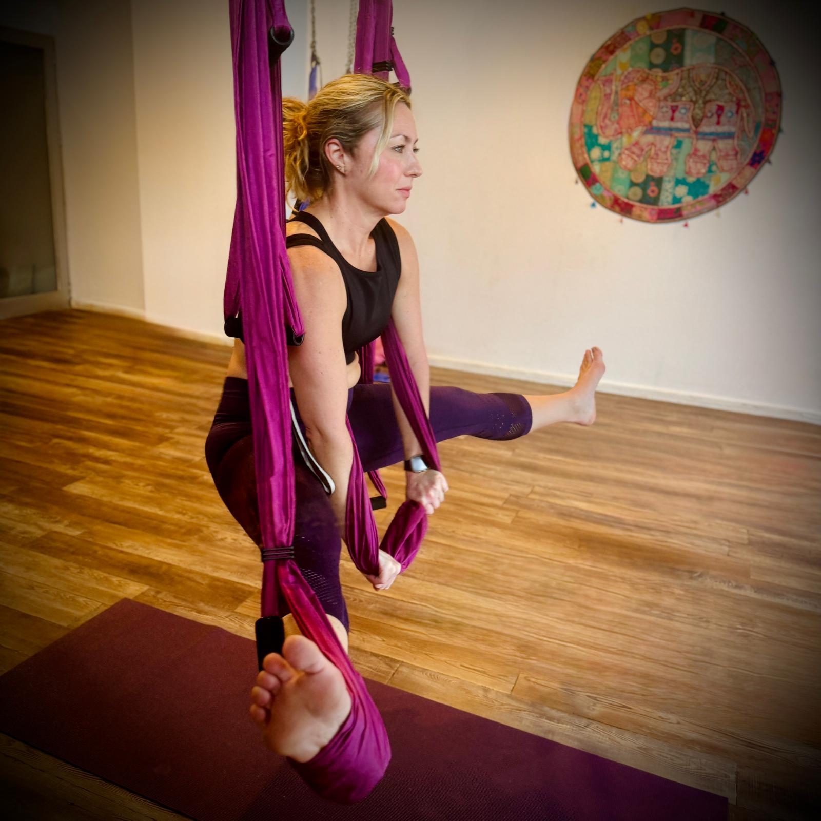 Entre otras, soy Instructora de Pilates Suelo, Terapia Holística a través del Yoga, Yin Yoga y estoy especializada en Yoga Aéreo. He cursado decenas de formaciones y talleres pero el yoga aéreo cambió mi forma de ver la práctica con columpio y entender la profundidad y alcance de la misma.